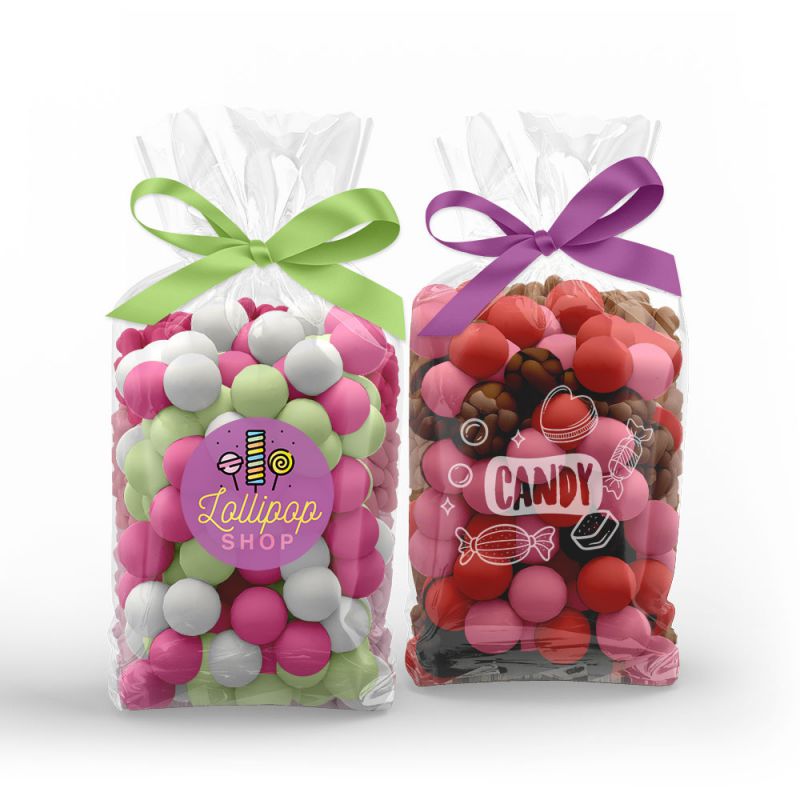 Buste a fondo quadro, esagonale o rettangolare, con fondo trasparente o di carta bianca, realizzabili in polipropilene, in vari formati e spessori, ideali per il confezionamento di dolci e prodotti alimentari.