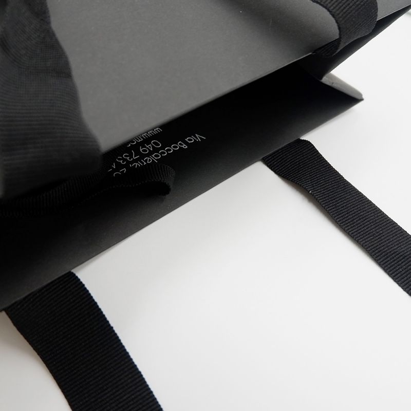 Shopper in carta con manici in gros grain affogato, disponibile in diversi colori e altezze. Realizzabili in carta di diverse grammature e goffrature, plastificata opaca oppure lucida. Massima personalizzazione attraverso stampe offset, a caldo, serigrafiche, o a rilievo. Risvolti interni e rinforzo di fondo personalizzabili. Manici annodati o affogati nei risvolti.