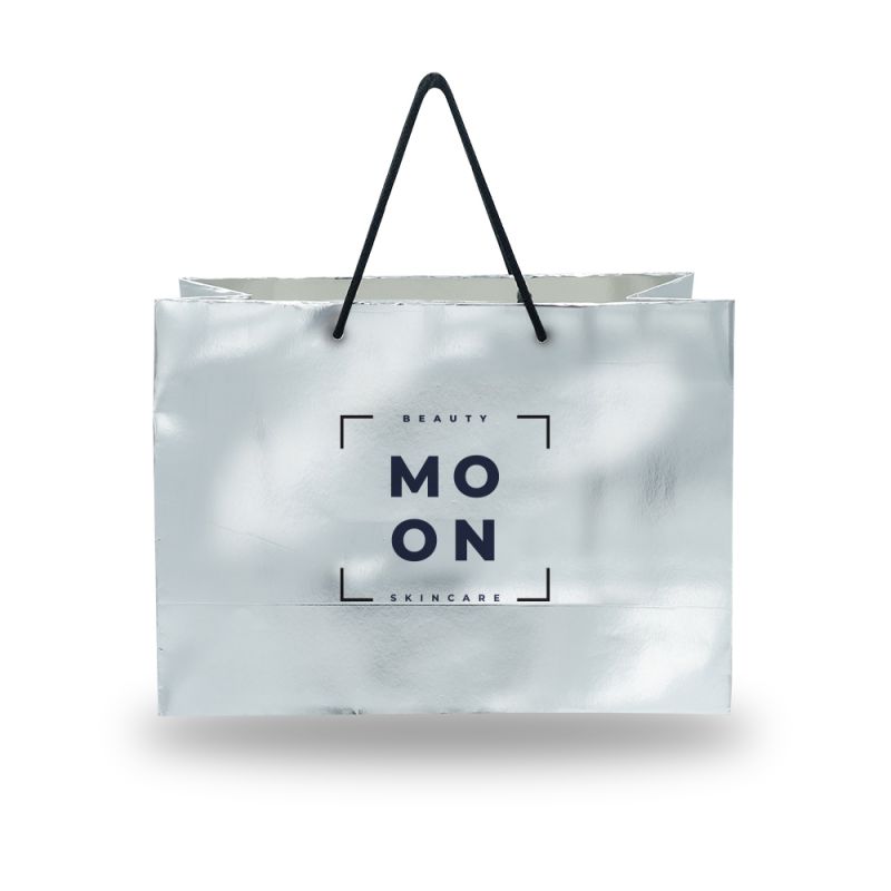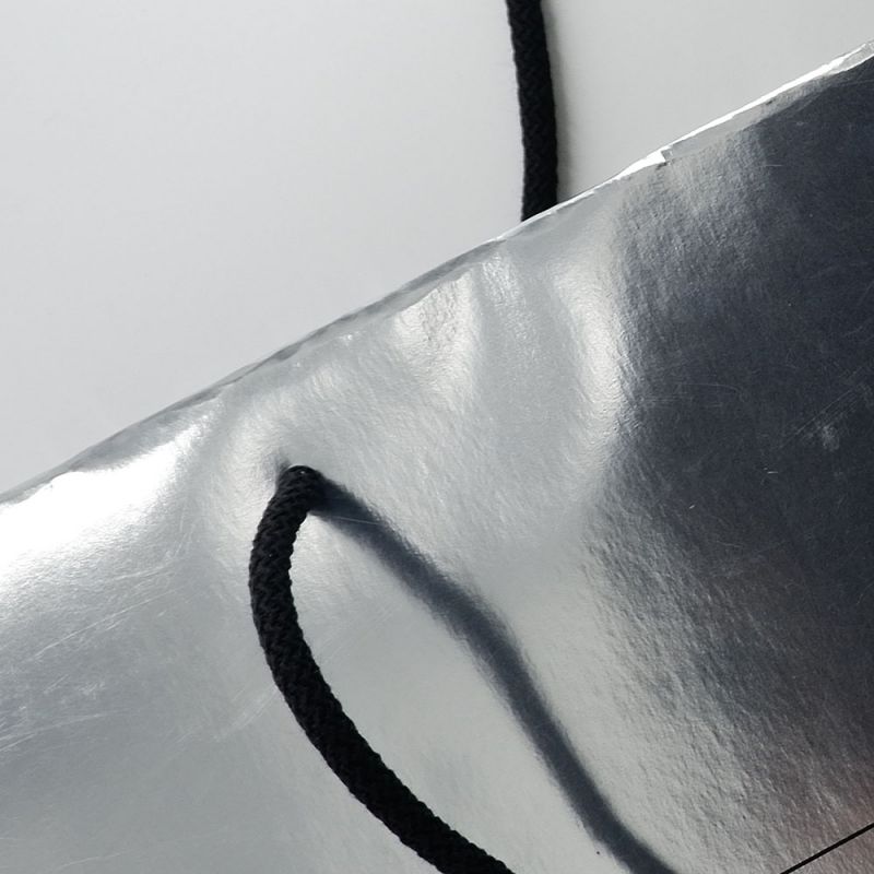Shopper in carta plastificata argento con manici in fettuccia, cotone, gros grain o raso annodato, disponibili in diversi colori e altezze. Realizzabili in carta di diverse grammature e goffrature, plastificata opaca oppure lucida. Massima personalizzazione attraverso stampe offset, a caldo, serigrafiche, o a rilievo. Risvolti interni e rinforzo di fondo personalizzabili. Manici annodati o affogati nei risvolti.