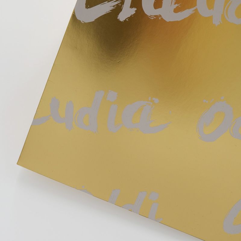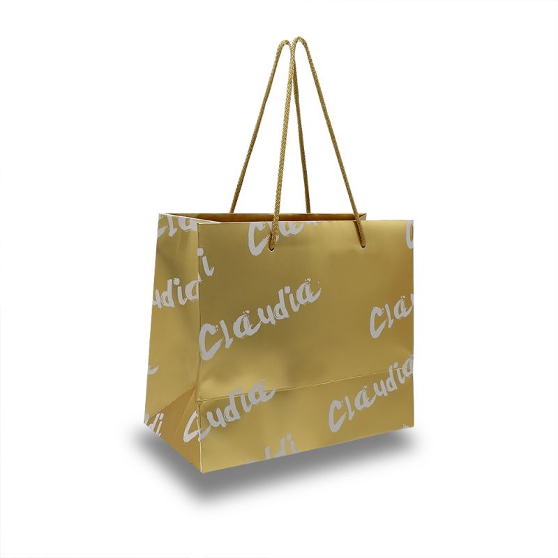 Shopper in carta plastificata oro con manici in fettuccia, cotone o raso annodato, disponibili in diversi colori e altezze. Realizzabili in carta di diverse grammature e goffrature, plastificata opaca oppure lucida. Massima personalizzazione attraverso stampe offset, a caldo, serigrafiche, o a rilievo. Risvolti interni e rinforzo di fondo personalizzabili. Manici annodati o affogati nei risvolti.